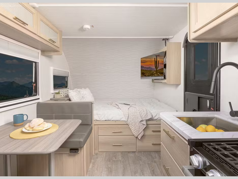 Sleeps 2 Slides 1 Length 22 ft Furnace BTU 20000 btu Available Beds Full Cooktop Burners 3 Number of Awnings 1 LP Tank Capacity 20 LBS Water Heater Type On Demand AC BTU 18000 btu TV Info LR 32" 12V Smart TV Awning Info 12' Lighted Power Awning Number of LP Tanks 2 Shower Type Radius