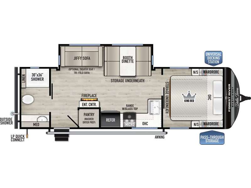 When you are wanting a little more interior space in your next travel trailer, take a look inside! This large slide out widens the center so you can easily make meals using full amenities without having to move for someone walking from the front private bedroom to the rear spacious bathroom. There is a king-size bed with storage on both sides, underneath and above, plus a space saving sliding door. The oversized booth dinette and jack knife sofa offer comfortable seating as well as extra sleeping space for overnight guests. And the fireplace is just a nice feature to enjoy. And the large pantry is a convenient feature you will surely appreciate. There is so much more!