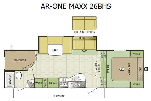 Dual entry doors lead into this family friendly AR-ONE MAXX fifth wheel by Starcraft RV featuring double bed bunks, a large slide for added roominess inside, and a rear bath layout with its own private entry.